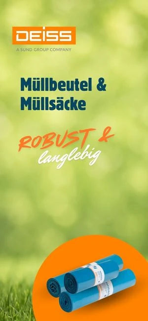 Sehr beliebte Produkte sind der Deiss Abfallsack 20010 in Blau, der mit seiner 120-Liter-Fassung besonders in Großbetrieben eingesetzt wird, sowie der Deiss Premium Plus Müllsack 10002, der durch extreme Reißfestigkeit und Stabilität überzeugt.