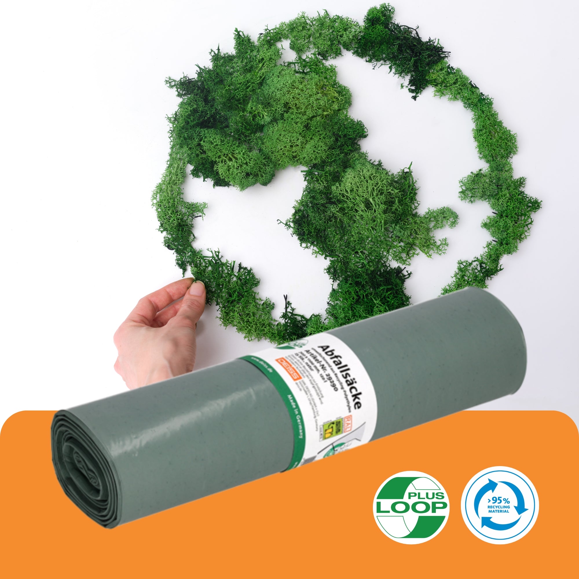 LOOP PLUS steht für nachhaltige Müllsäcke mit Zukunft. Der Abfallsack besteht nahezu vollständig aus recycelten Rohstoffen, ein Teil davon aus haushaltsnahen Abfällen. Der 120-Liter-Müllsack bietet hohe Zuverlässigkeit im täglichen Einsatz und unterstützt aktiv die Kreislaufwirtschaft durch den Einsatz von Recyclingmaterial.