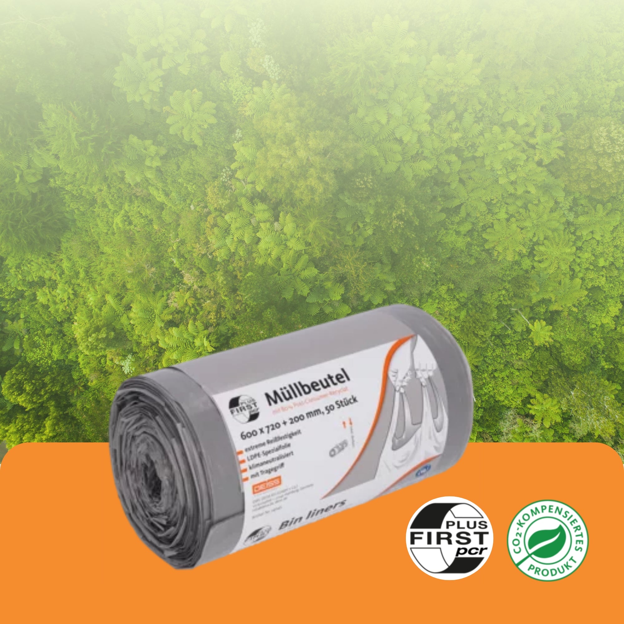 Der FIRST PLUS PCR Müllbeutel ist speziell für die professionelle Gebäudereinigung entwickelt. Durch optimierte Materialien wird der CO₂-Fußabdruck reduziert, verbleibende Emissionen werden über zertifizierte Klimaschutzprojekte kompensiert. Der hohe Anteil an Post-Consumer-Rezyklat, der Easy Opener und die schnell öffnende Banderole sorgen für effizientes Arbeiten im Reinigungsalltag.