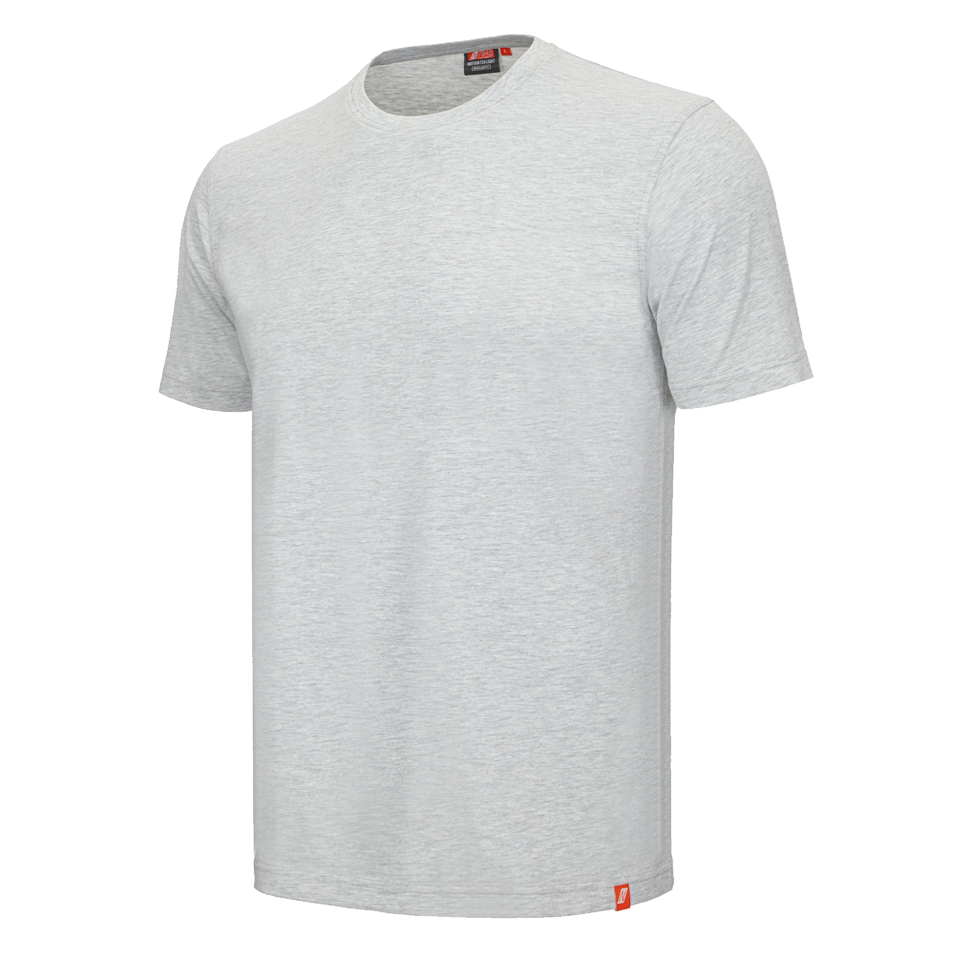 On a white background, the NITRAS MOTION TEX LIGHT T-shirt by AS Arbeitsschutz GmbH is depicted. It is a simple blue short-sleeved T-shirt made of soft OEKO-TEX certified cotton with a round neckline and a small orange label at the lower left hem.
