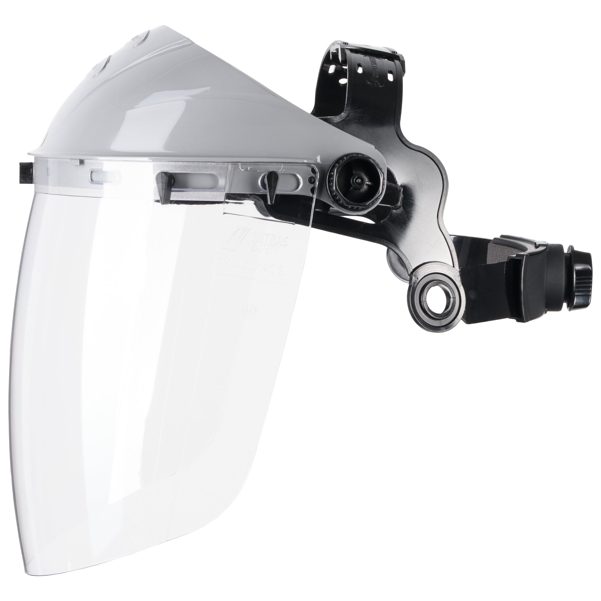 The NITRAS VISION PROTECT visor is a high-quality protective visor that has been specially developed for long-term use. With a sturdy support body in black and gray and transparent viewing panels (color code: 1410), it offers a clear view and protection. The headgear is equipped with an innovative dial system that allows for gradual size adjustment, while the additional head protection hood and fleece sweatband on the forehead ensure maximum comfort. The padded neckband significantly increases wearing comfort. The visor is easy to fold up and the lenses are replaceable, making it a long-lasting companion in the PPE risk category II category.