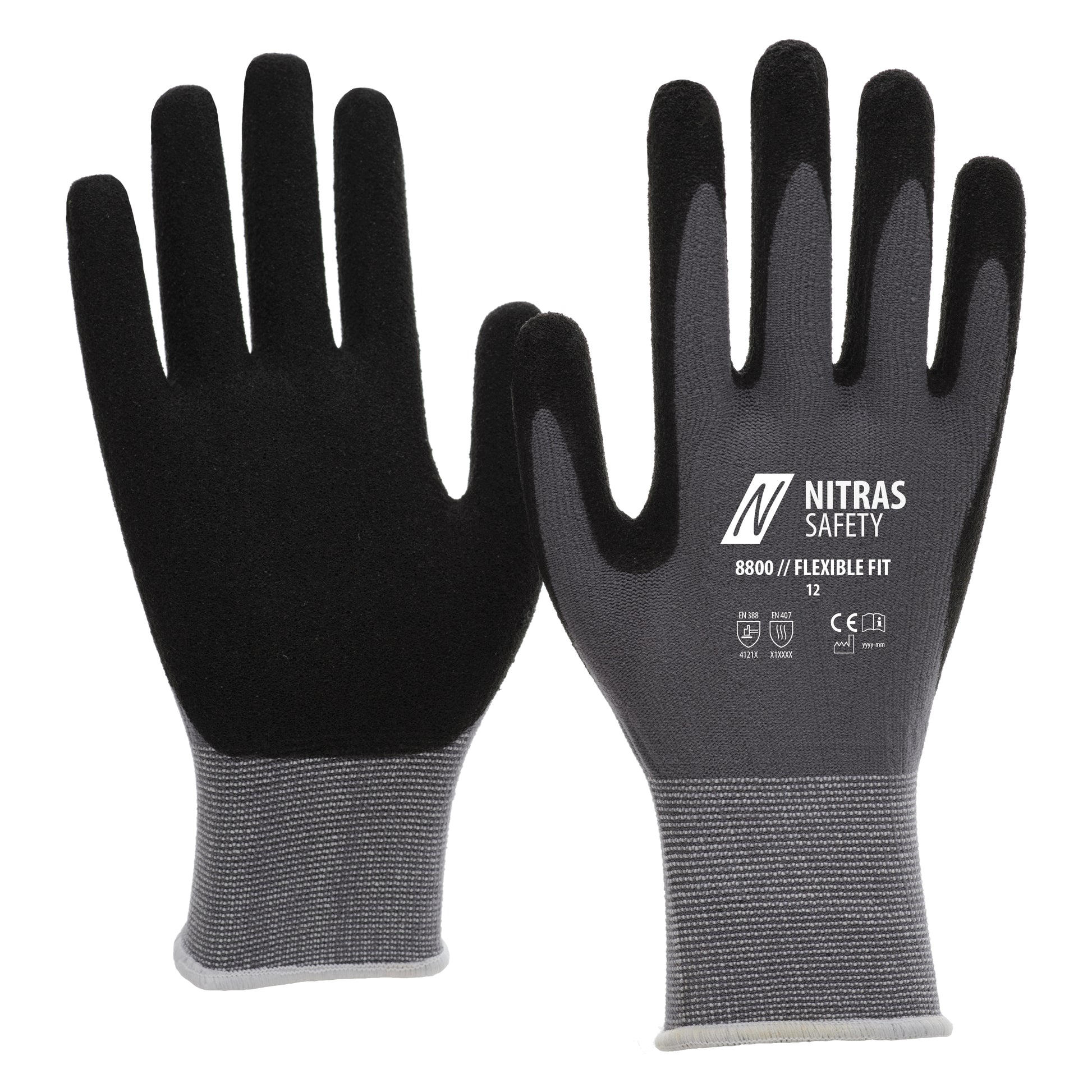 Die NITRAS FLEXIBLE FIT Montagehandschuhe sind die perfekte Wahl für Profis, die auf der Suche nach zuverlässigem Schutz und maximaler Beweglichkeit sind. Diese grauen Handschuhe mit schwarzer Nitril-Beschichtung (Farbcode: 1210) sind teilbeschichtet auf Innenhand und Fingerkuppen und bieten einen Strickbund für optimalen Halt. Sie garantieren perfekten Tragekomfort und Fingerfertigkeit, sind für den Lebensmittelkontakt geeignet und bieten Schutz gegen Kontaktwärme bis zu 100°C für 15 Sekunden. Die Handschuhe sind von Premium-Qualität, erfüllen den OEKO-TEX STANDARD 100® und sind besonders feinfühlig, ideal für Arbeiten mit kleinen Teilen. Sie zeichnen sich durch ihre Rutschfestigkeit, perfekten Grip und hohe Abriebfestigkeit (bis zu 20.000 Scheuertouren) aus und gehören zur PSA-Risikokategorie II.