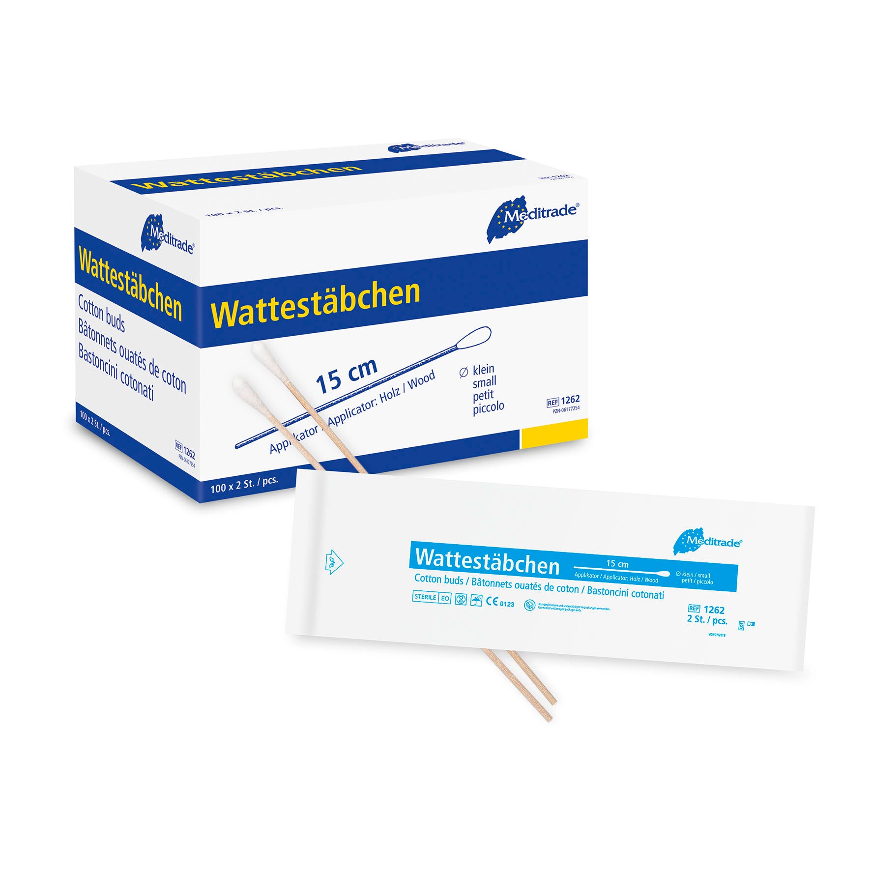 Wattestäbchen zu 2 Stk steril verpackt, Länge: 15 cm, kleiner Kopf, Holz | Packung (200 Stück)